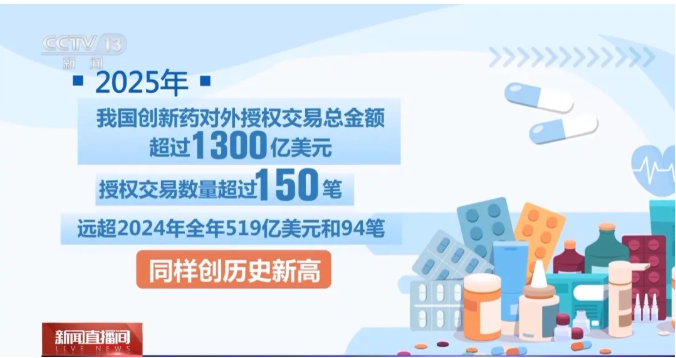 记者今天从国家药监局获悉,2025年我国已批准上市的创新药达76个,大幅超过2024年全年48个,创历史新高。此外,2025年我国创新药对外授权交易总金额超过1300亿美元,授权交易数量超过150笔,同样创历史新高。