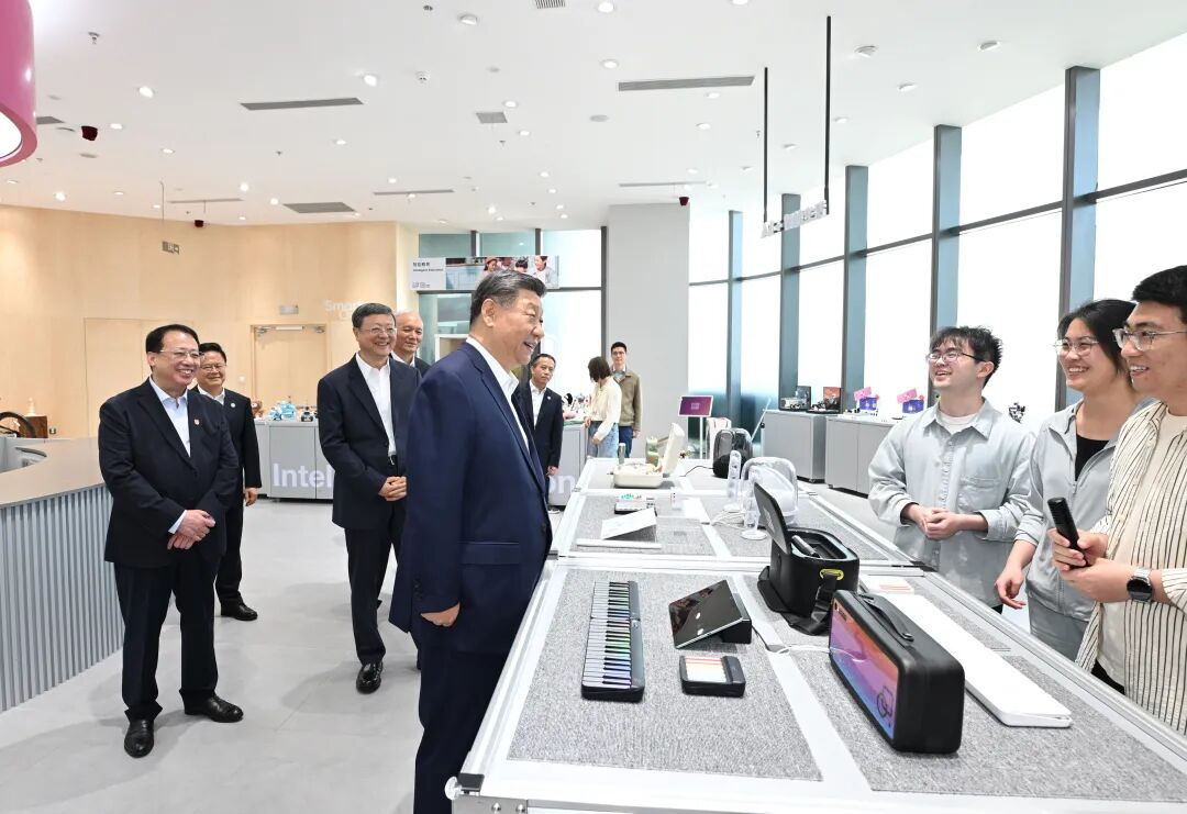 2025年4月29日,中共中央总书记、国家主席、中央军委主席习近平在上海考察。这是习近平总书记在位于徐汇区的上海“模速空间”大模型创新生态社区人工智能产品体验店考察。新华社记者 谢环驰 摄